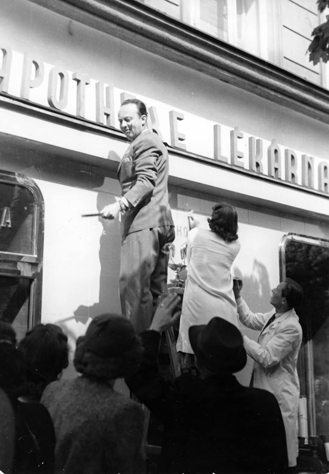 Празднование освобождения Чехословакии, обратите внимание на закрашенную немецкую надпись, май 1945 года: