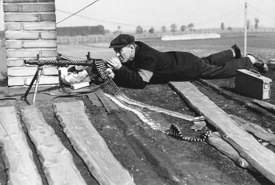 Охрана лагеря немецких военнопленных повстанцем с пулеметом MG 34 в мае 1945 года:
