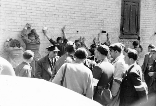 Раненый повсталец, на этом месте теперь супермаркет Альберт, май 1945 года: